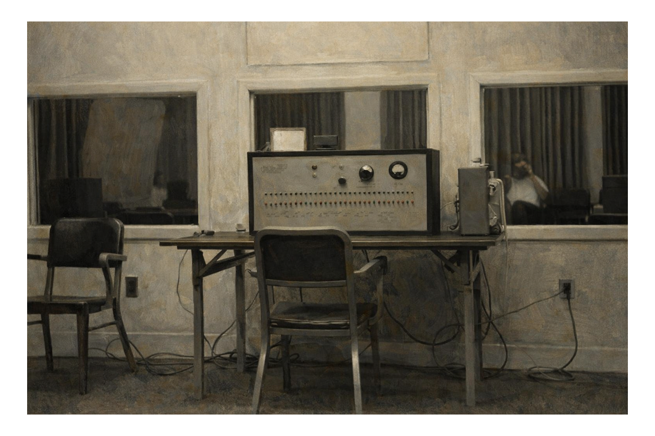 Scene 12: The Shock Experiment rooms at Yale, with a wall, three two-way mirrored windows, and a long table with the shock machine.
